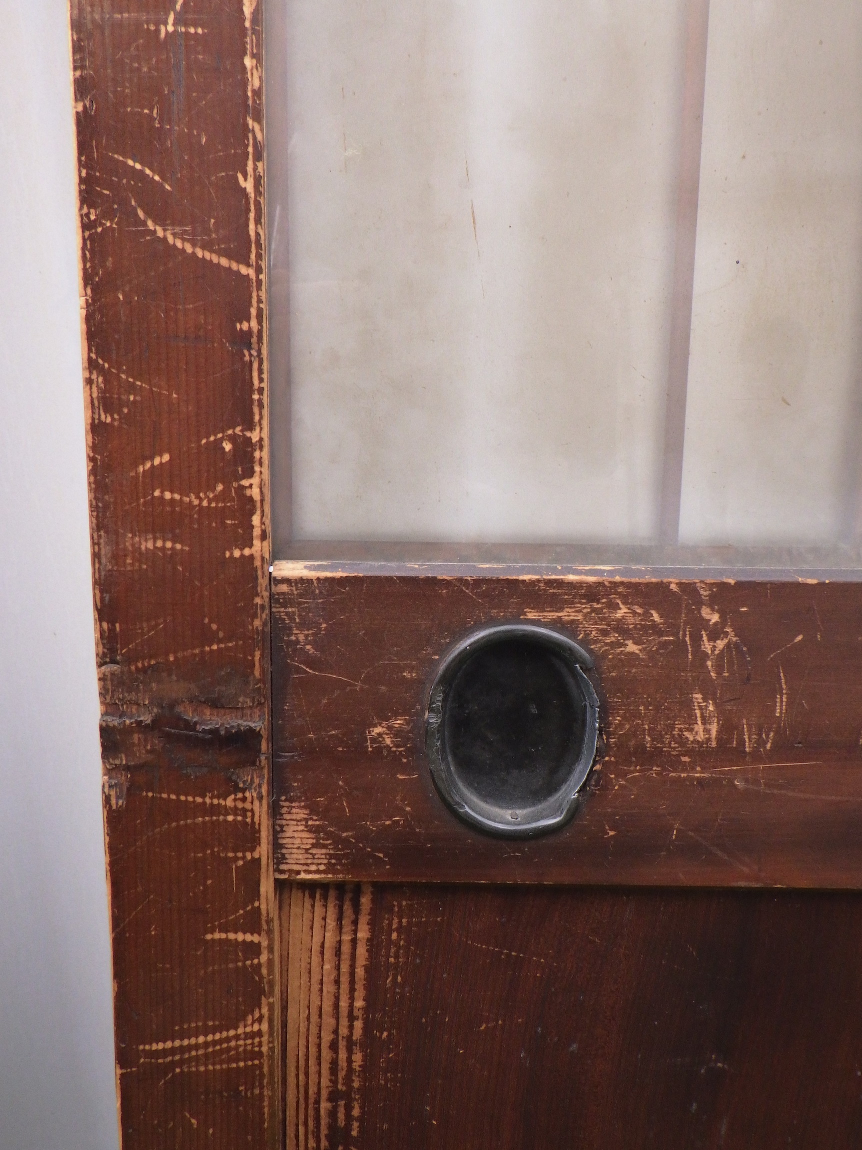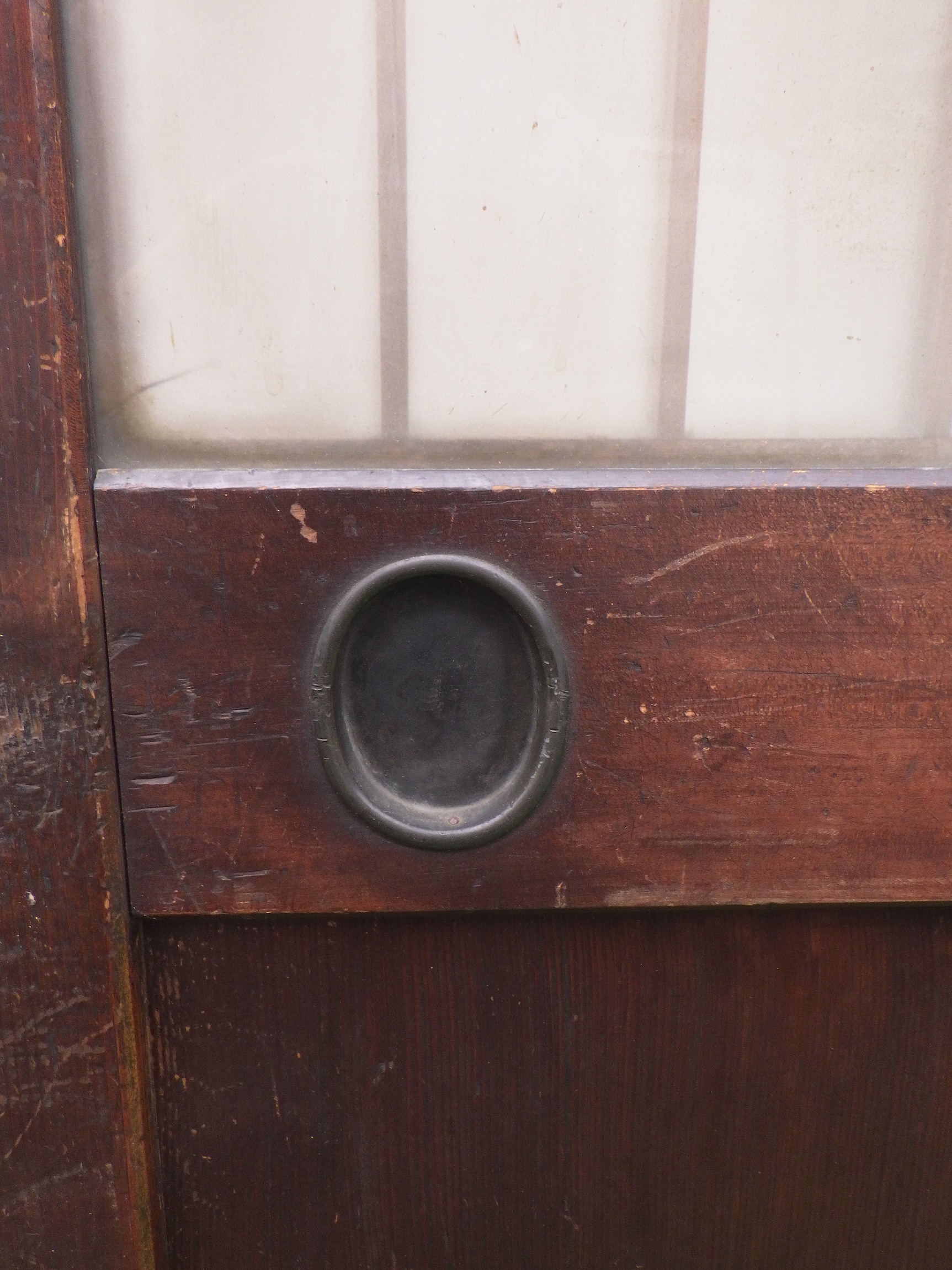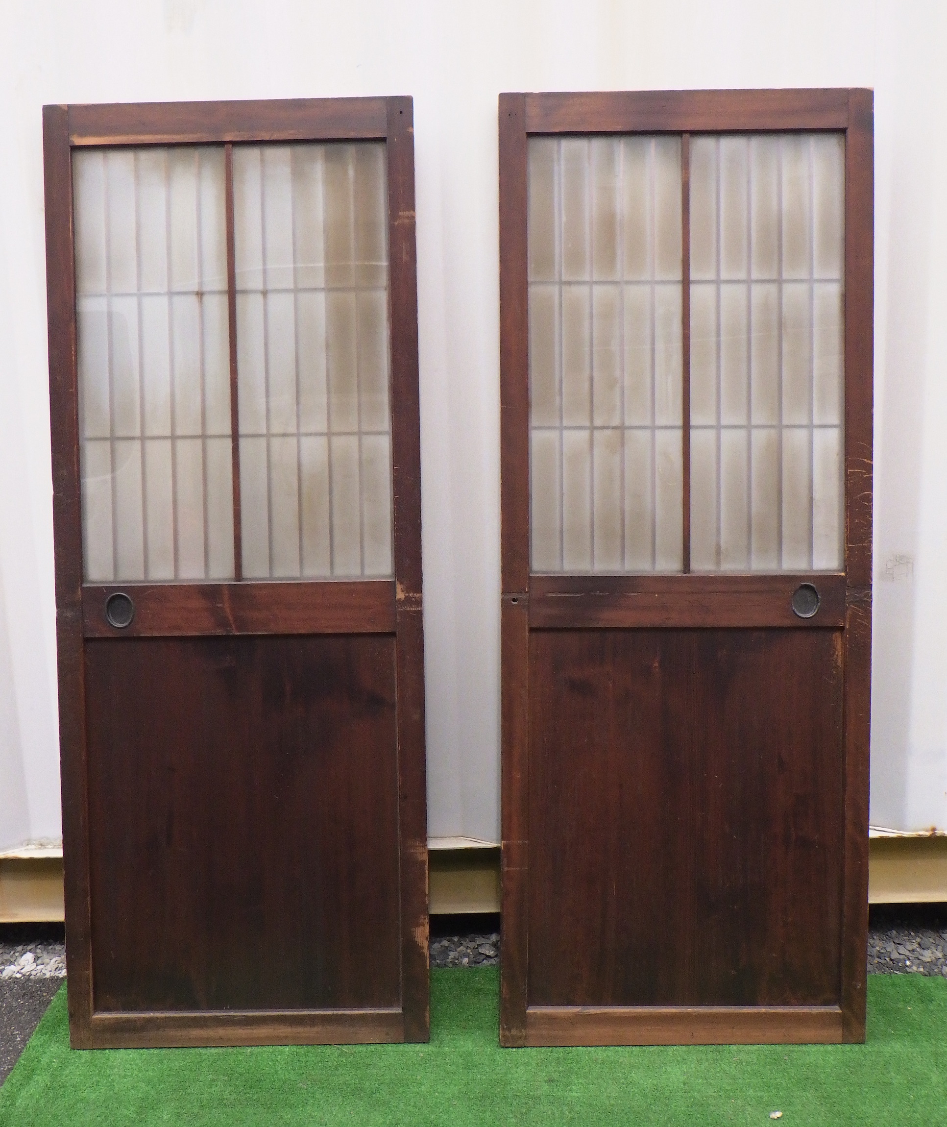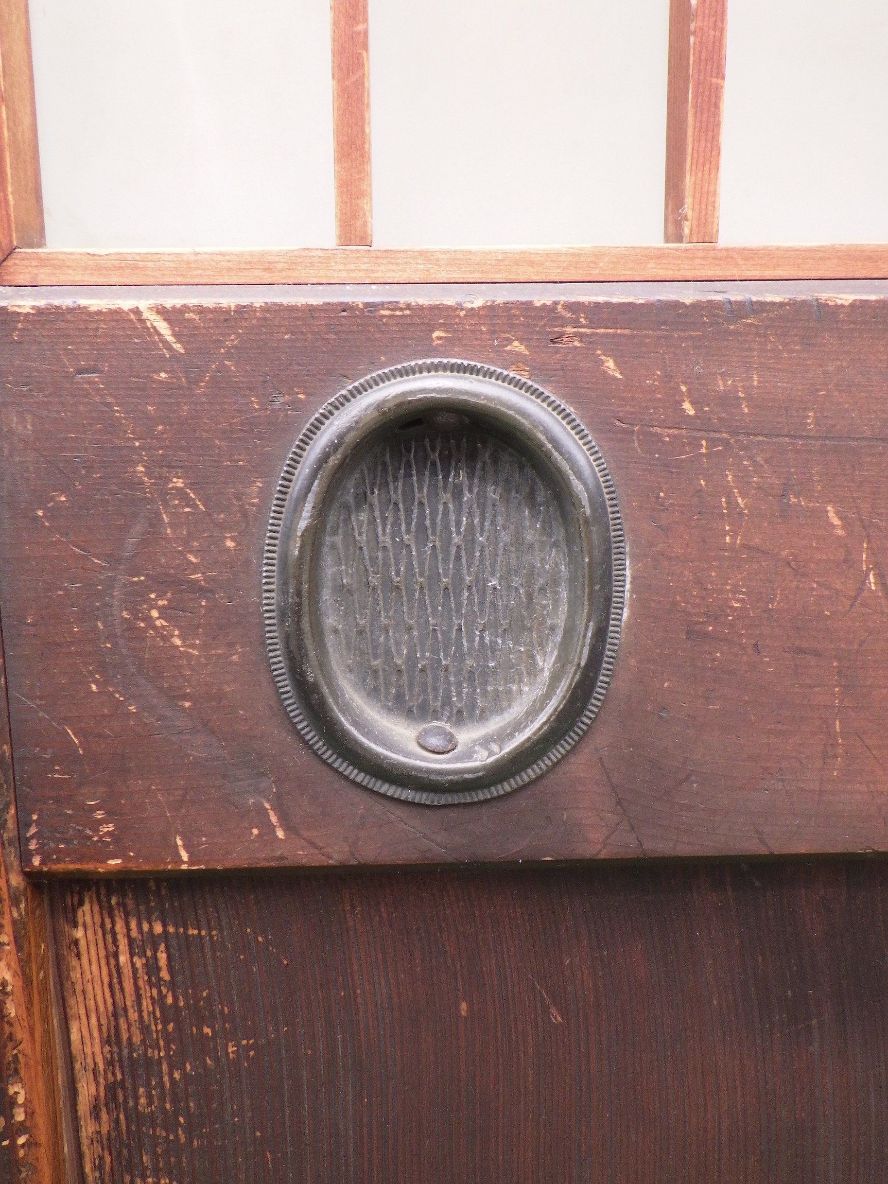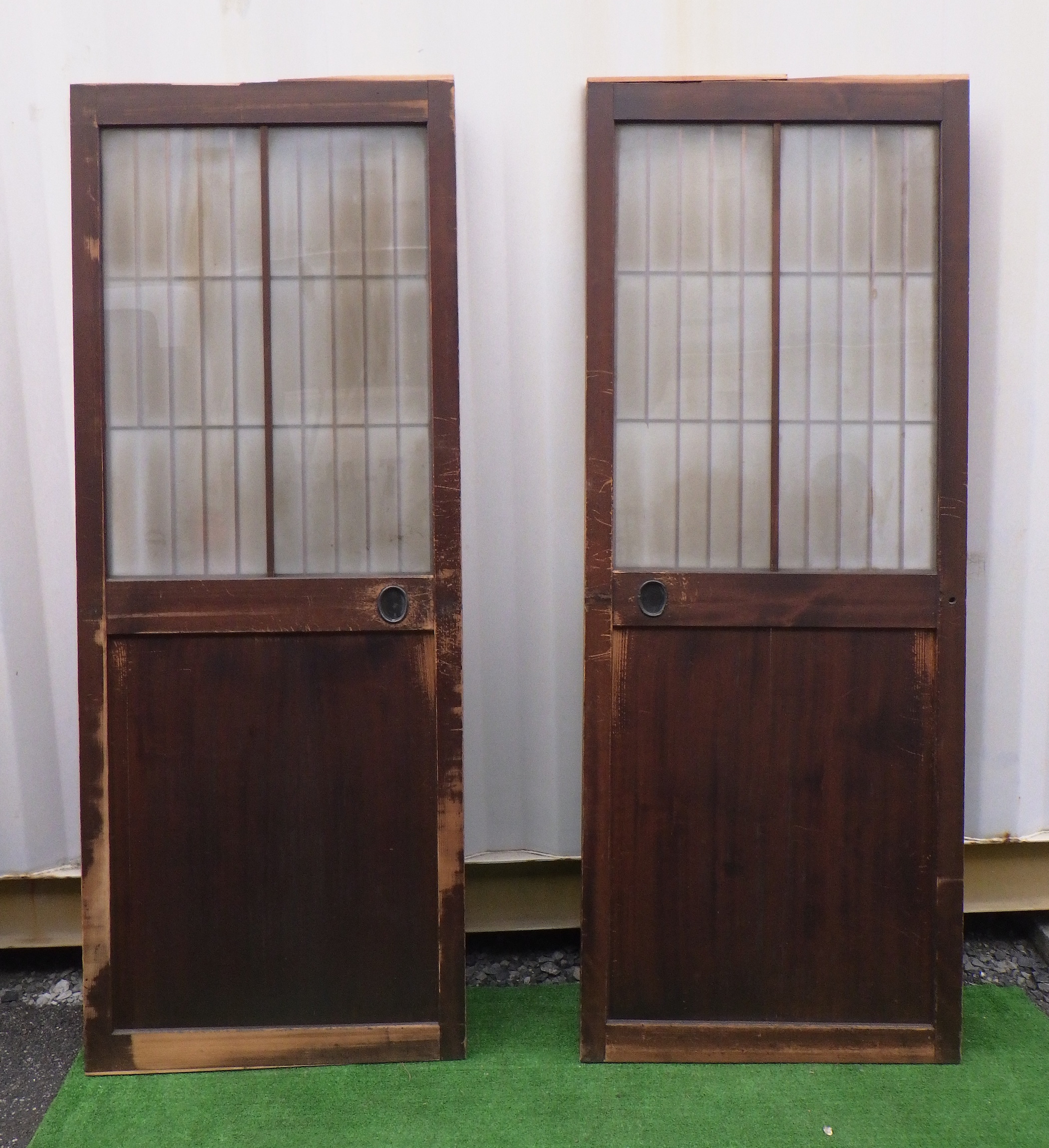 わけあり品。3枚全て鍵はついていません。東京江東区の民家で使われていた戸です。以下個々の詳細となります。 ②は他の3枚と引き手のデザインが異なります。また、片面の引き手は割れている箇所があります。 ③と④は、格子の一部に折れている箇所があります。また腰板に隙間が見られるため、接着が必要です。 もともとどんな建物で使われていたかブログに載せてみましたのでこちらをご覧ください。 ①は完売致しました。