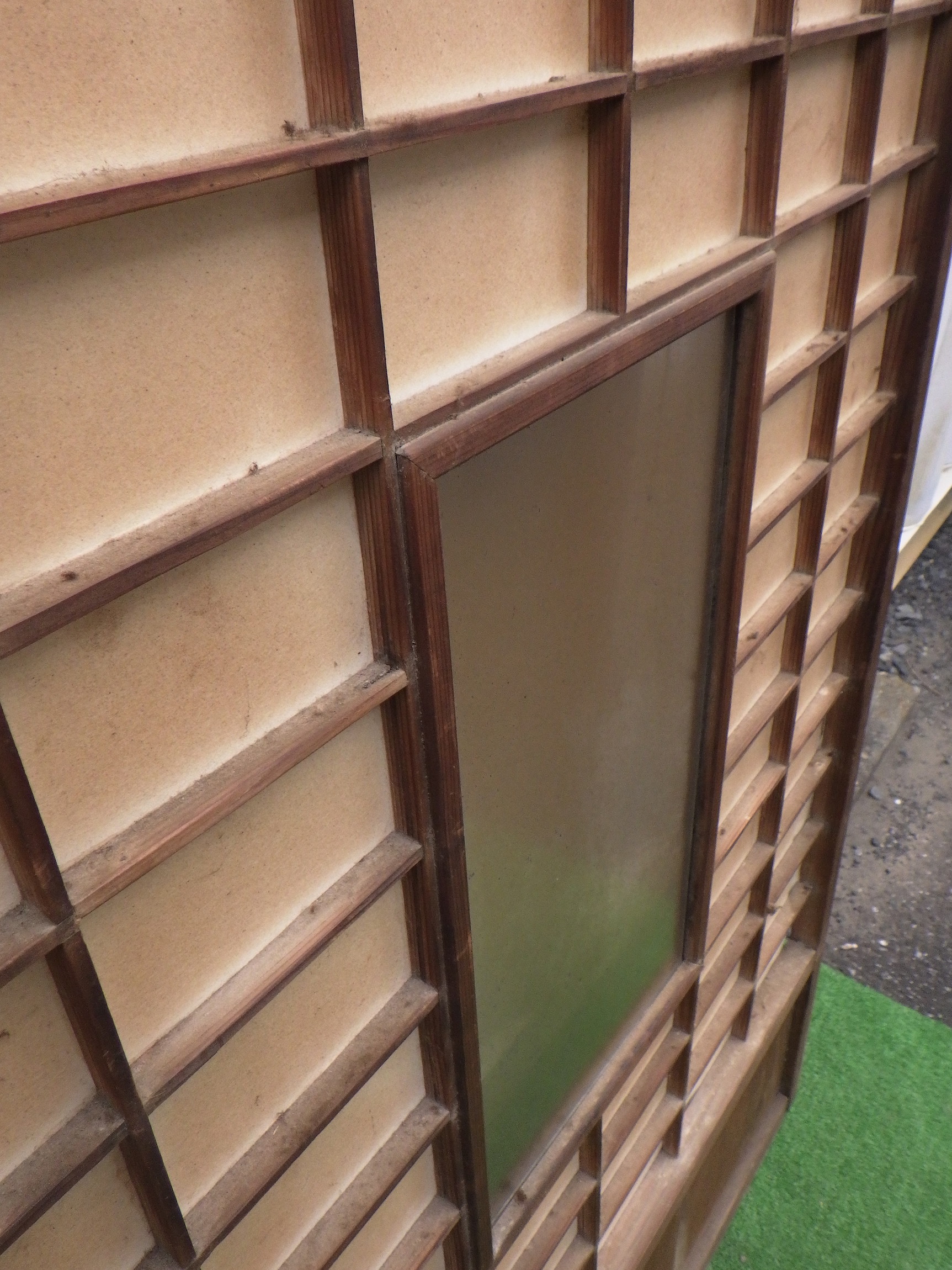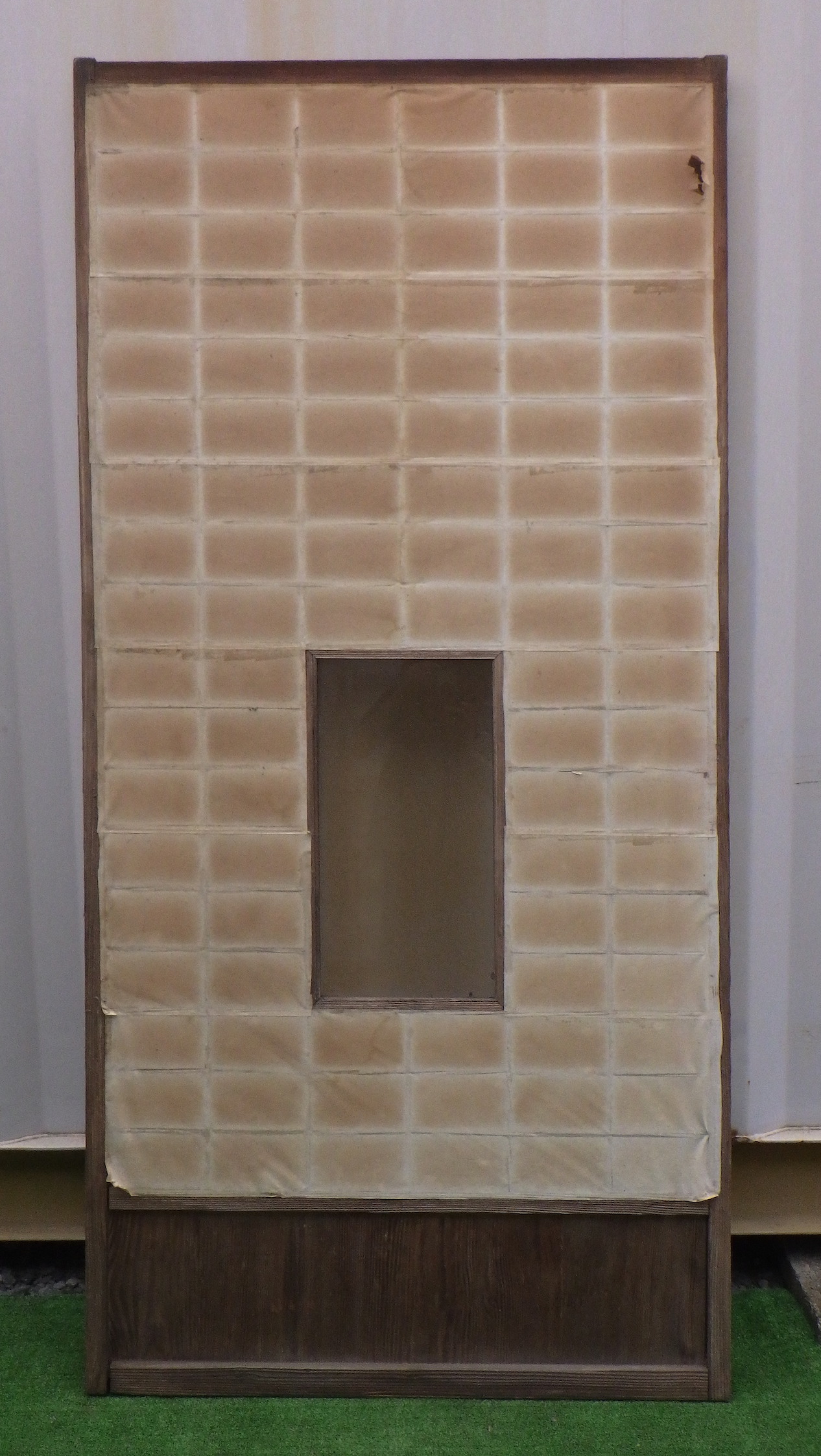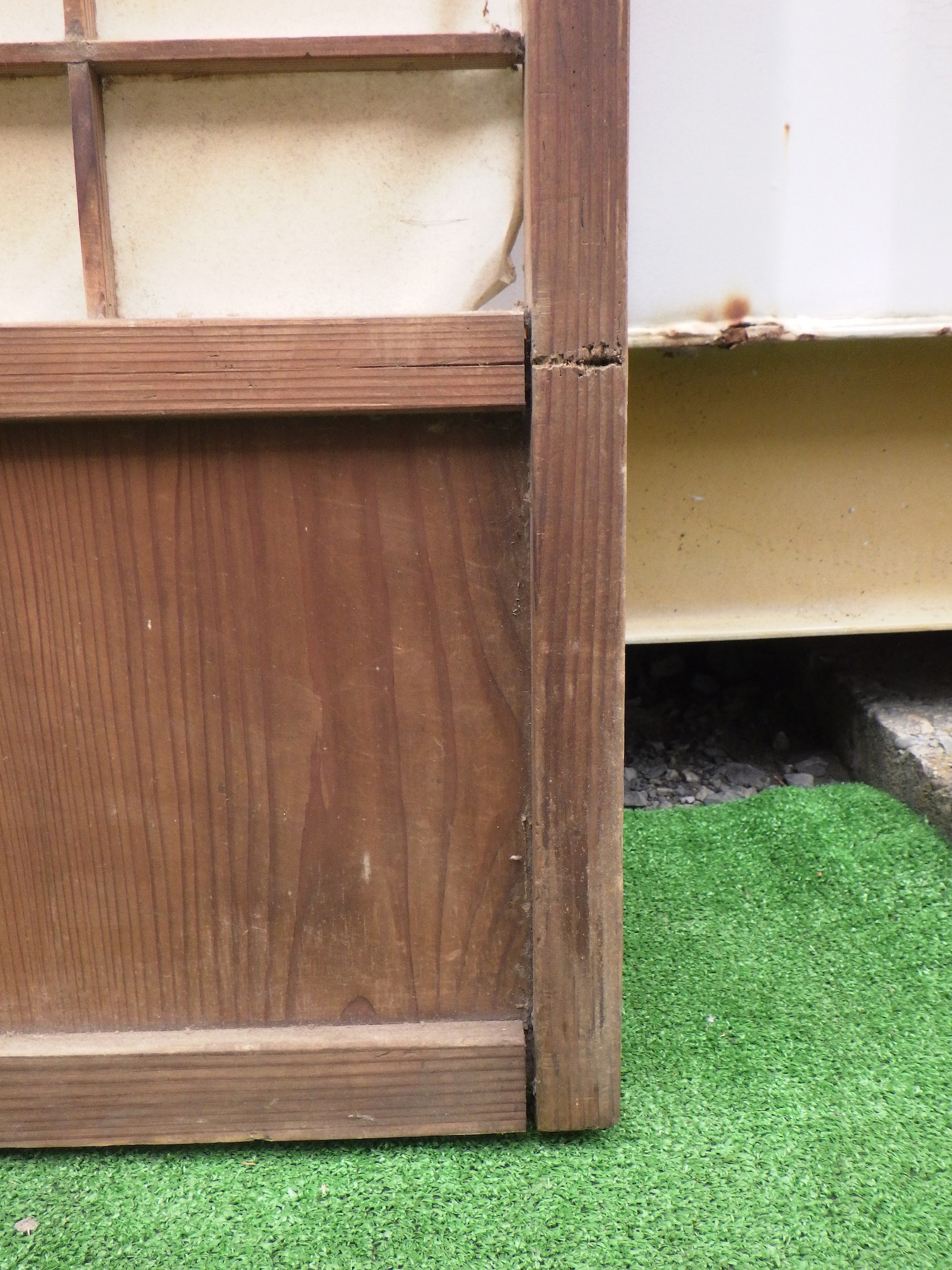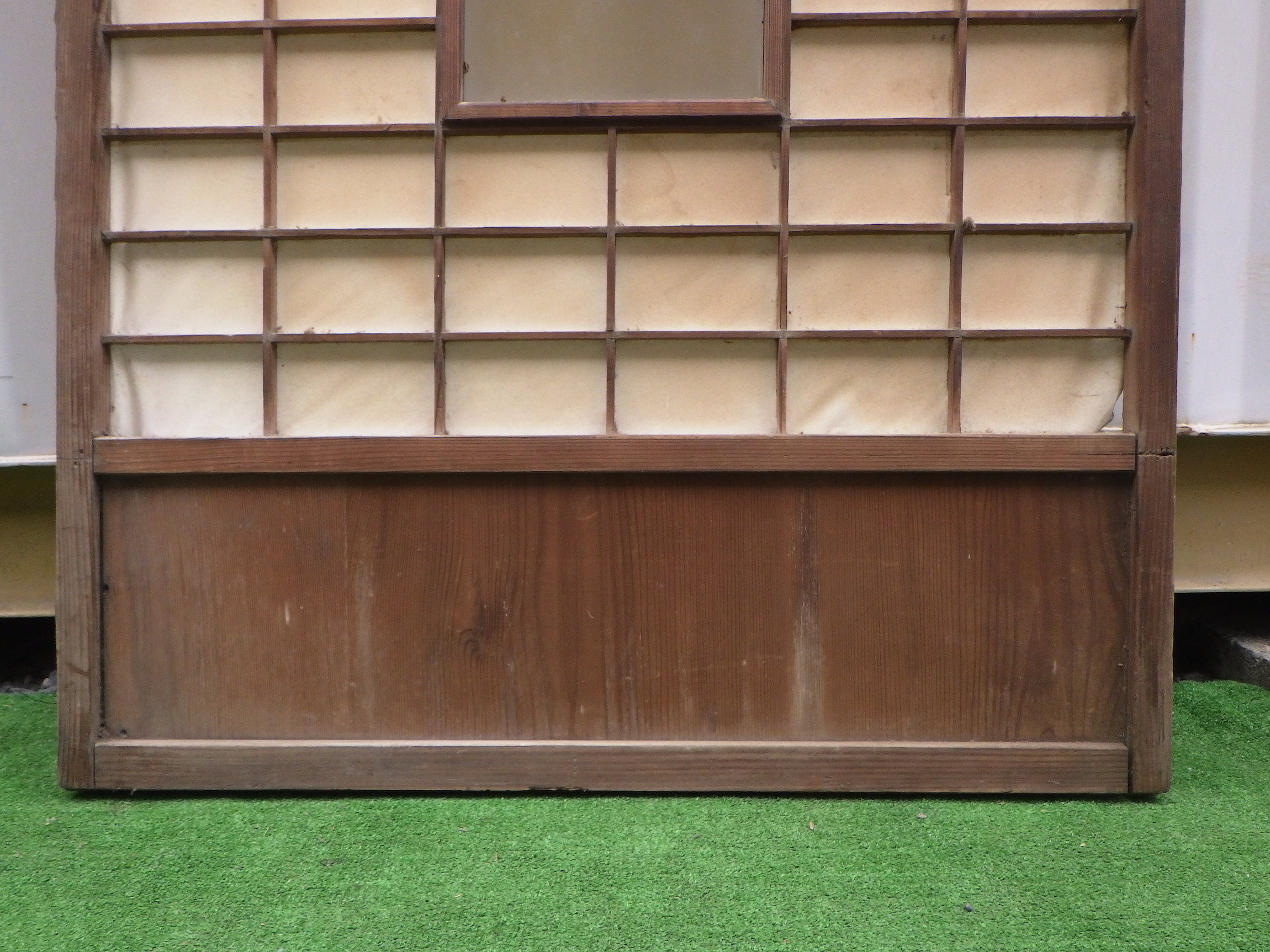 わけあり品。片側の縦桟が緩んで抜けてしまうため。腰板に隙間があるため接着が必要です。中ガラスは経年変化でレトロな雰囲気があります。